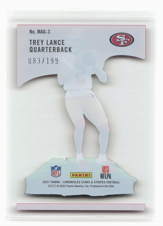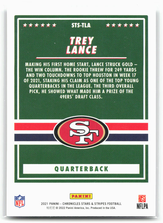 This is a nice example of a 2021 Panini Chronicles #STS-TLA Trey Lance Stars and Stripes Other important information about this card:In 2021 Trey Lance played for the San Francisco...