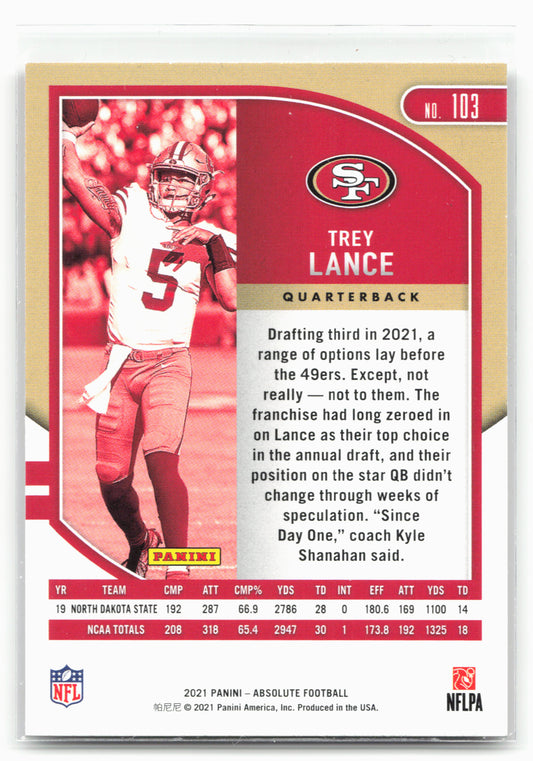 This is a nice example of a 2021 Panini Absolute #103 Trey Lance Retail Other important information about this card:RCIn 2021 Trey Lance played for the San Francisco 49ers.Please check...