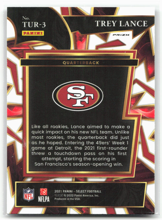 This is a nice example of a 2021 Panini Select #TUR-3 Trey Lance Turbocharged Other important information about this card:In 2021 Trey Lance played for the San Francisco 49ers.Please check...