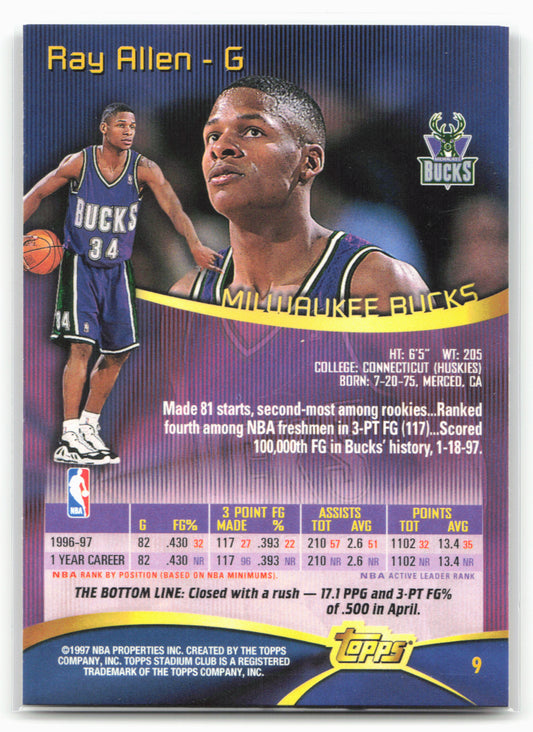 This is a nice example of a 1997-98 Stadium Club #9 Ray Allen Other important information about this card:In 1997 Ray Allen played for the Milwaukee Bucks.Please check out our...