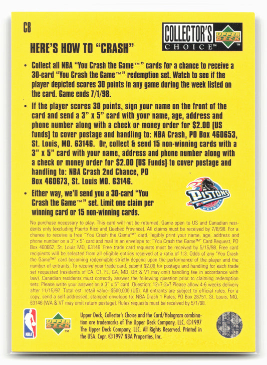 This is a nice example of a 1997-98 Collector's Choice #C8b Lindsey Hunter You Crash the Game Scoring Other important information about this card:December 22-18 1997;In 1997 Lindsey Hunter played...