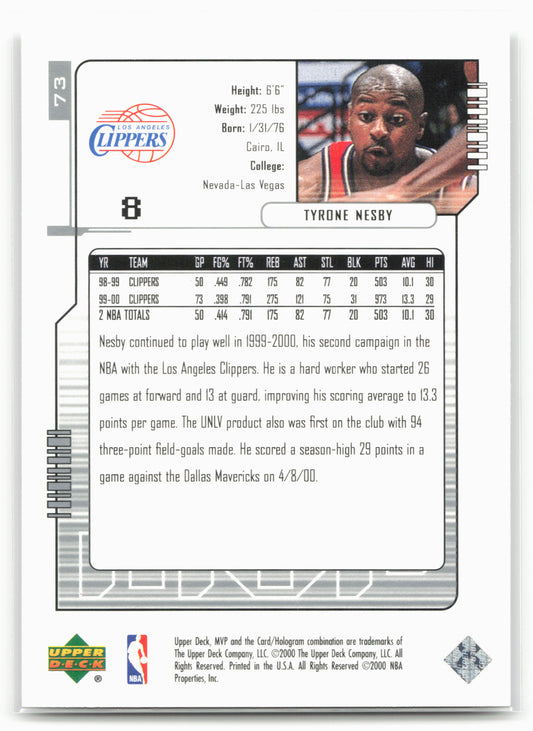 This is a nice example of a 2000-01 Upper Deck MVP #73 Tyrone Nesby Silver Script Other important information about this card:In 2000 Tyrone Nesby played for the Los Angeles...