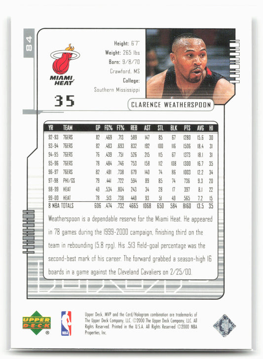 This is a nice example of a 2000-01 Upper Deck MVP #84 Clarence Weatherspoon Silver Script Other important information about this card:In 2000 Clarence Weatherspoon played for the Miami Heat.Please...