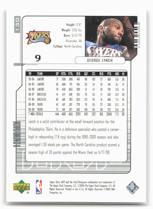 This is a nice example of a 2000-01 Upper Deck MVP #130 George Lynch Other important information about this card:In 2000 George Lynch played for the Philadelphia 76ers.Please check out...