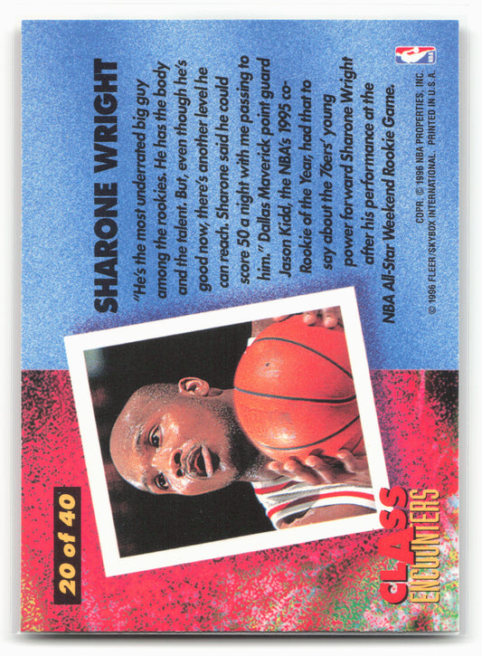 This is a nice example of a 1995-96 Fleer #20 Sharone Wright Class Encounters Other important information about this card:In 1995 Sharone Wright played for the Philadelphia 76ers.Please check out...