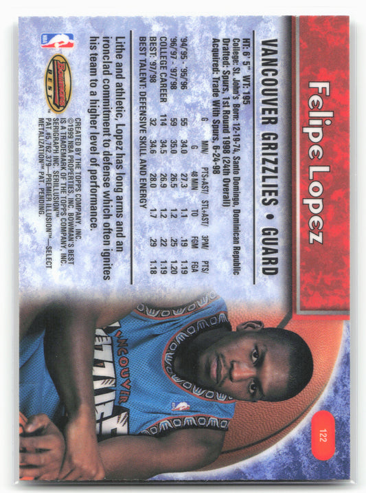 This is a nice example of a 1998-99 Bowman's Best #122 Felipe Lopez Other important information about this card:RCIn 1998 Felipe Lopez played for the Vancouver Grizzlies.Please check out our...