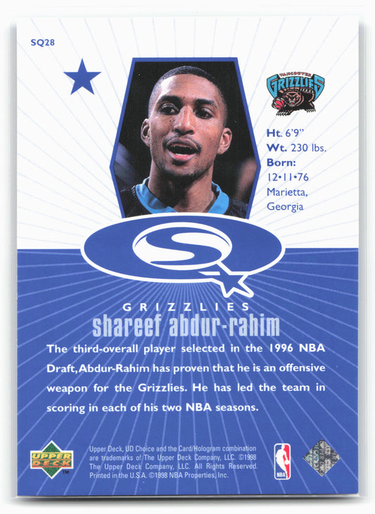 This is a nice example of a 1998-99 UD Choice #SQ28 Shareef Abdur-Rahim StarQuest Blue Other important information about this card:24704In 1998 Shareef Abdur-Rahim played for the Vancouver Grizzlies.Please check...