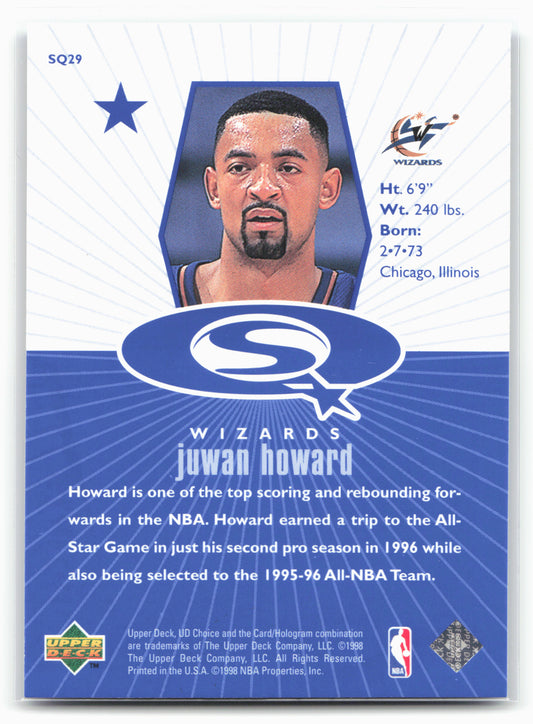 This is a nice example of a 1998-99 UD Choice #SQ29 Juwan Howard StarQuest Blue Other important information about this card:24705In 1998 Juwan Howard played for the Washington Wizards.Please check...