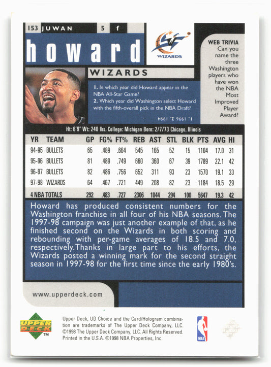 This is a nice example of a 1998-99 UD Choice Preview #153 Juwan Howard Other important information about this card:In 1998 Juwan Howard played for the Washington Wizards.Please check out...